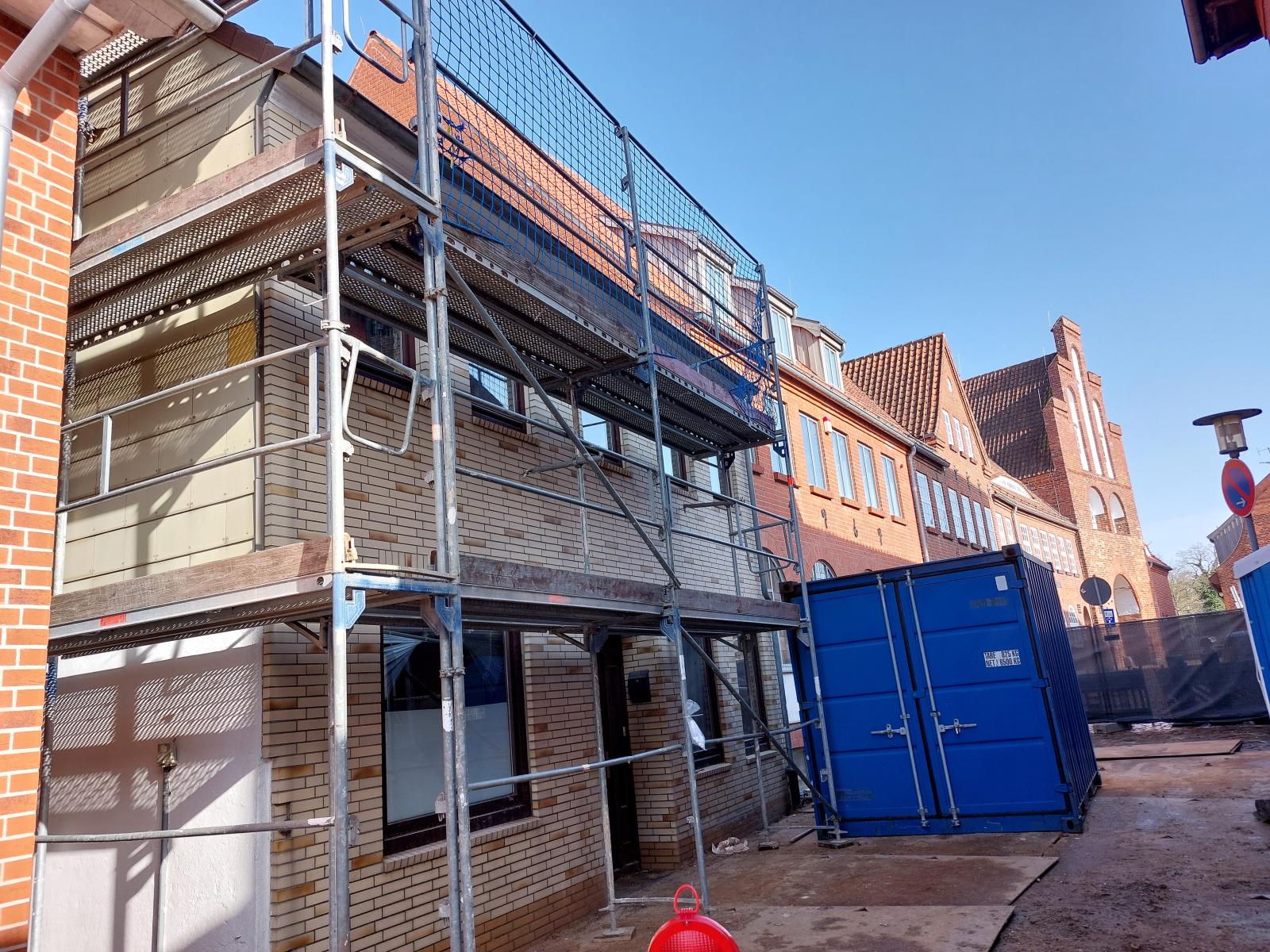Wer in Neustadt nahe dem Kremper Tor unterwegs ist, landet seit Mitte Februar in der Straße Haakengraben vor einer Vollsperrung: Links neben dem zeiTTor-Museum ist eine Baustelle eingerichtet. Das Reihenhaus (im Foto eingerüstet) wird im Sommer 2026 abgerissen. An der Stelle entsteht das Cap-Arcona-Dokumentationszentrum nach den Entwürfen von Pysall Architekten aus Berlin, die 2025 den Architekturwettbewerb gewonnen hatten.
